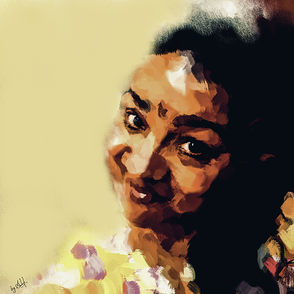 A woman with a warm smile and engaging eyes is portrayed against a soft yellow background. The strokes suggest a rich, paint-like texture, providing... more