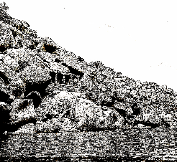 A high-contrast black and white photo displays a rocky hillside with what appears to be an ancient temple or structure carved directly into the stones. The body of water in the foreground reflects a portion of the hill and the historic construction, creating a serene yet stark image.