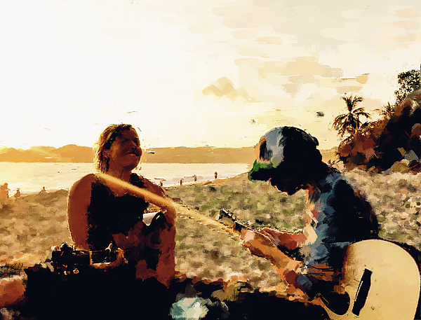 A woman and a man are sitting on a beach at sunset, with the man tuning a guitar and woman singing while playing a guitar. Her attention is fixed on... more